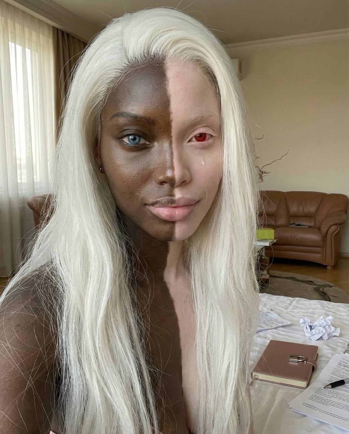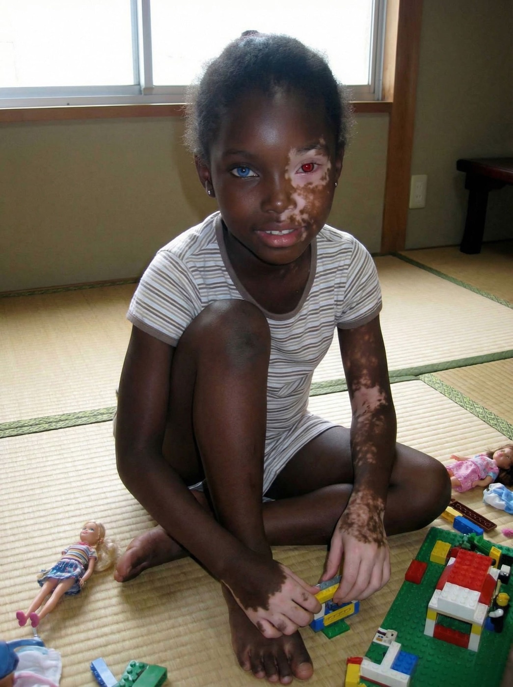Then I was born, just an ordinary mixed girl. The changes started when I was around five or six. It’s not just vitiligo, it’s a rare condition. Even after all these years, doctors never told us exactly what it was. It affected not only my skin, but my eyes too. My eyesight got much worse, so yes, I wear contact lenses to see you better haha