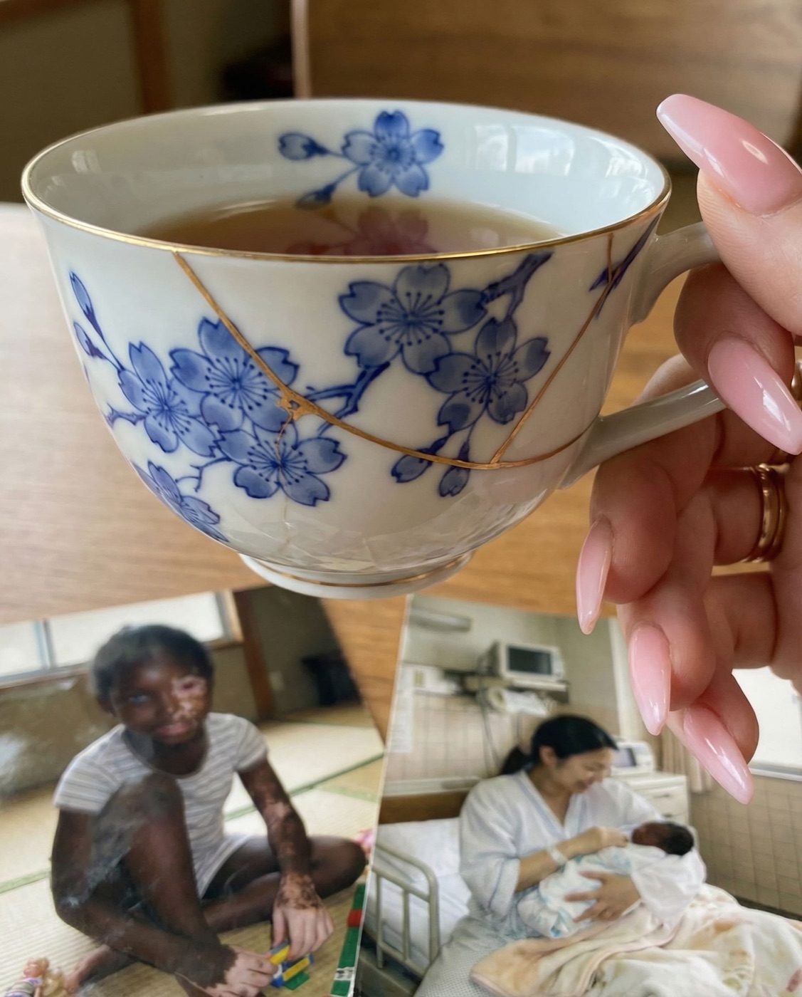 One day she showed me a cracked cup filled with gold. She said: kintsugi. Then she touched the line on my neck and said, “Kintsugi skin. Let this become your beauty, Eva.”